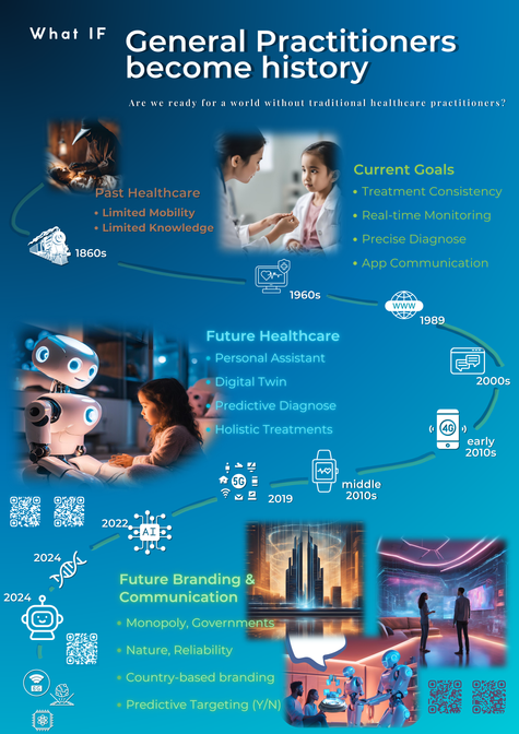 Based on researches and news reports, this project visually explores the evolution of healthcare providers—past, present, and future—highlighting how advancements in technology, particularly artificial intelligence, are transforming communication and branding within the industry. The findings are presented in the form of poster.